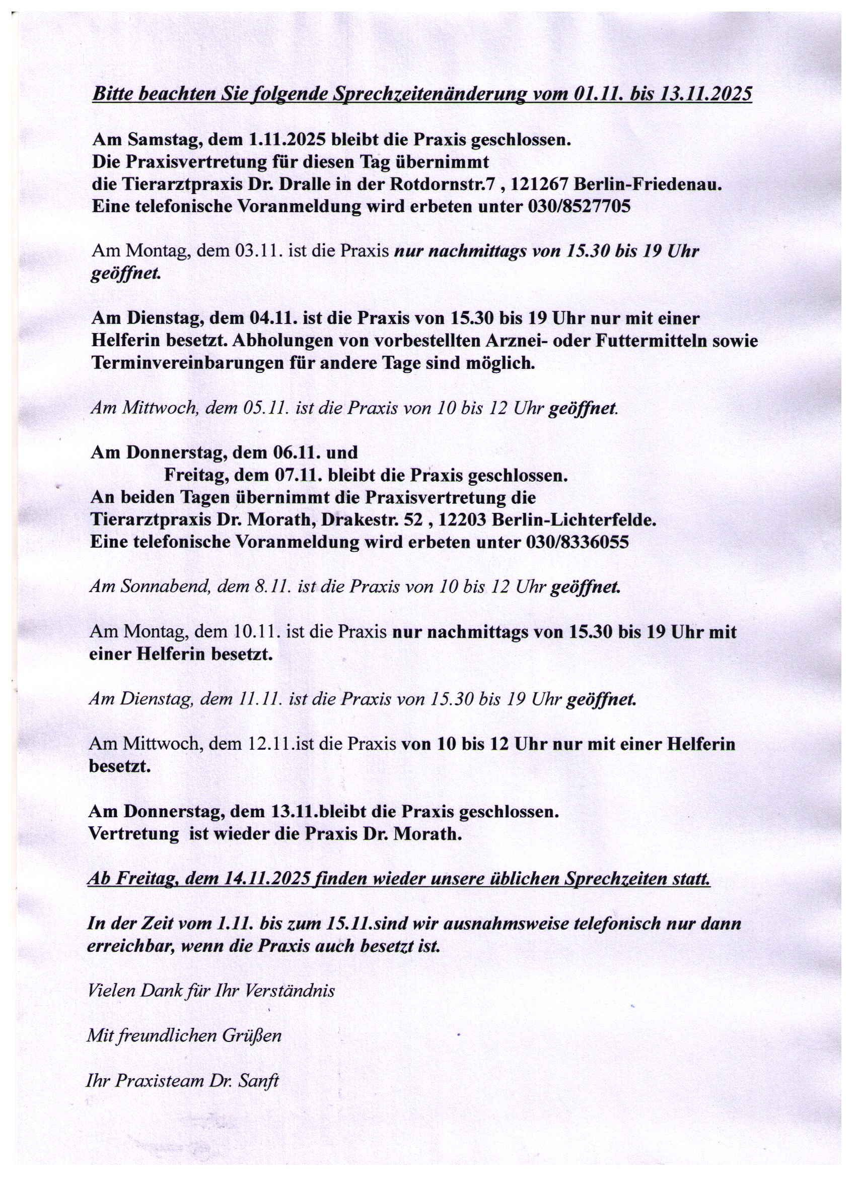 Geänderte Sprechzeiten für die Urlaubszeit: